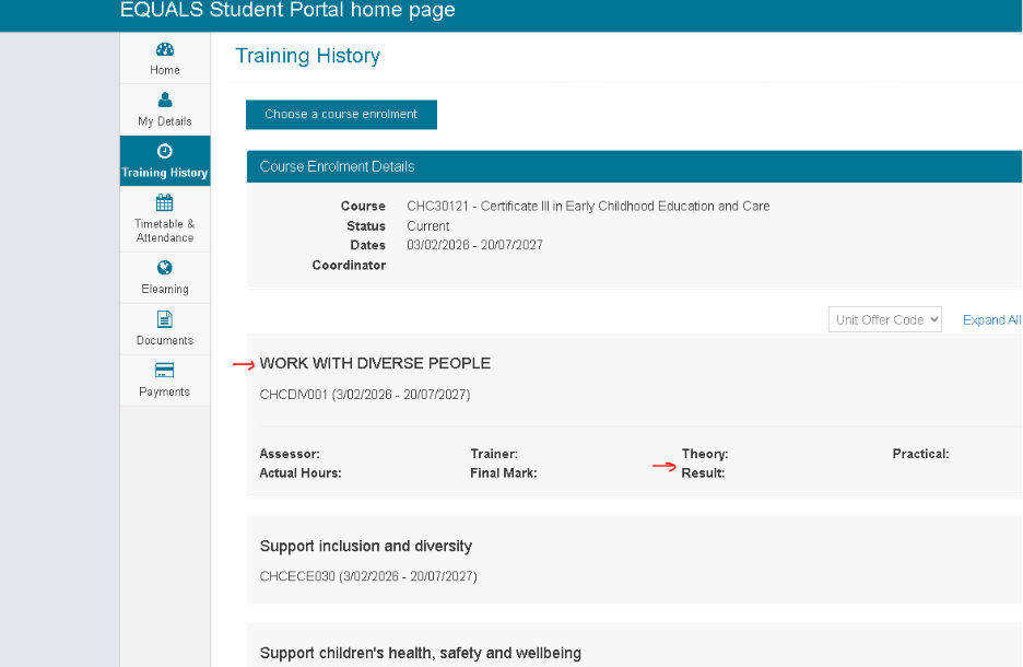 Under the Training History tab, you will be able to see your overall grades listed under each unit within your course.